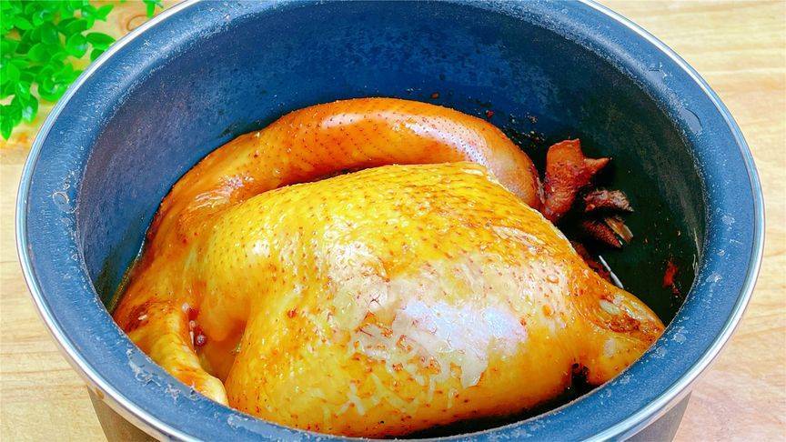 把1只雞放入電飯鍋中,無水無油,出鍋香氣四溢,皮嫩肉爛,真香